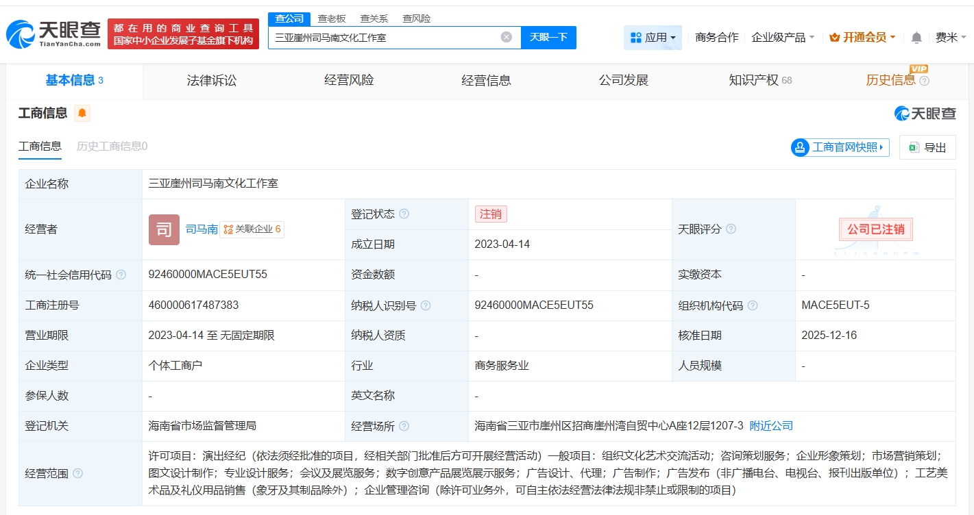 天眼查app显示,近日,三亚崖州司马南文化工作室登记状态由存续变更为注销。