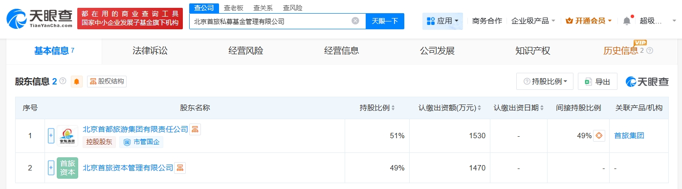 天眼查app显示,近日,北京首旅私募基金管理有限公司成立,法定代表人为李源光,注册资本3000万人民币,经营范围为私募股权投资基金管理、创业投资基金管理服务。股东信息显示,该公司由北京首都旅游集团有限责任公司及旗下北京首旅资本管理有限公司共同持股。