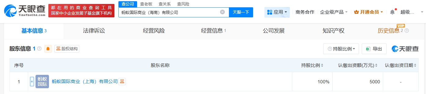 天眼查工商信息显示,近日,蚂蚁国际商业(海南)有限公司成立,法定代表人为石文宜,注册资本5000万人民币,经营范围包括信息技术咨询服务、软件开发、接受金融机构委托从事信息技术和流程外包服务等。股东信息显示,该公司由蚂蚁国际商业(上海)有限公司全资持股。