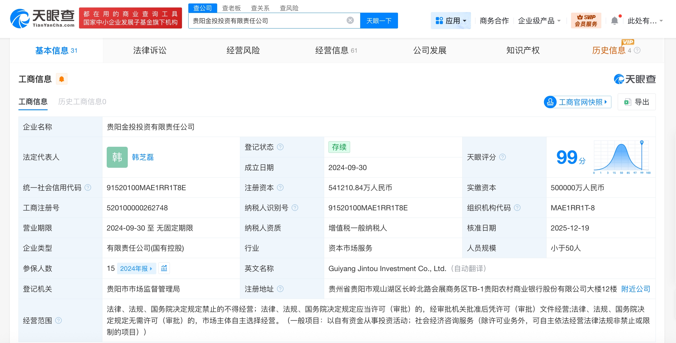 该公司成立于2024年9月,法定代表人为韩芝磊,经营范围为以自有资金从事投资活动、社会经济咨询服务,由贵阳市财政局、贵州省国有资本运营有限责任公司共同持股。