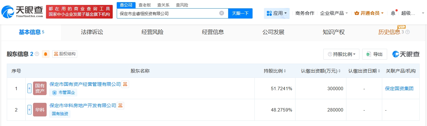 天眼查工商信息显示,近日,保定市金睿恒投资有限公司成立,法定代表人为王伟,注册资本58亿人民币,经营范围为以自有资金从事投资活动。股东信息显示,该公司由保定市国有资产经营管理有限公司、保定市华科房地产开发有限公司共同持股。
