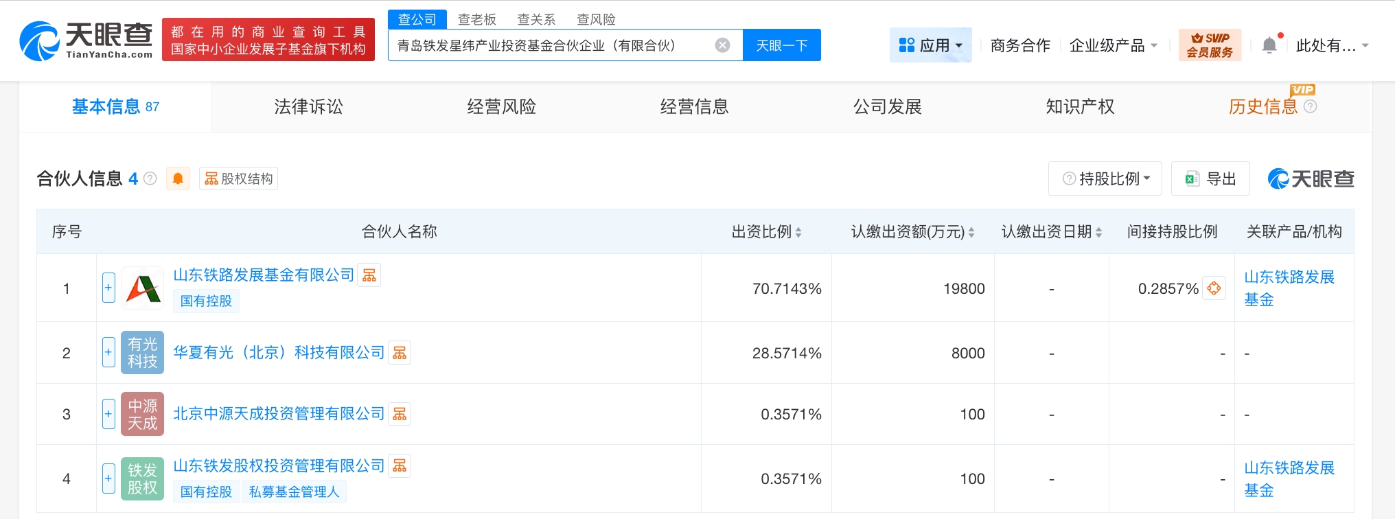天眼查app显示,近日,青岛铁发星纬产业投资基金合伙企业(有限合伙)成立,执行事务合伙人为山东铁发股权投资管理有限公司、北京中源天成投资管理有限公司,出资额2.8亿人民币,经营范围为以私募基金从事股权投资、投资管理、资产管理等活动。合伙人信息显示,该基金由山东铁路发展基金有限公司、华夏有光(北京)科技有限公司、北京中源天成投资管理有限公司、山东铁发股权投资管理有限公司共同出资。