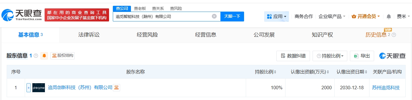 天眼查app显示,近日,追觅智能科技(滁州)有限公司成立,法定代表人为朱春,注册资本2000万人民币。经营范围包括智能机器人的研发、智能机器人销售、工业机器人制造等,由追觅创新科技(苏州)有限公司全资持股。