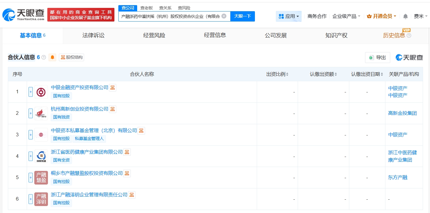 天眼查app显示,近日,产融浙药中瀛扶摇(杭州)股权投资合伙企业(有限合伙)成立,执行事务合伙人为中银资本私募基金管理(北京)有限公司、浙江产融泽钥企业管理有限责任公司,出资额5亿人民币,经营范围为股权投资、创业投资,由中银金融资产投资有限公司、杭州高新创业投资有限公司、中银资本私募基金管理(北京)有限公司、浙江省医药健康产业集团有限公司、桐乡市产融慧盈股权投资有限公司、浙江产融泽钥企业管理有限责任公司共同出资。