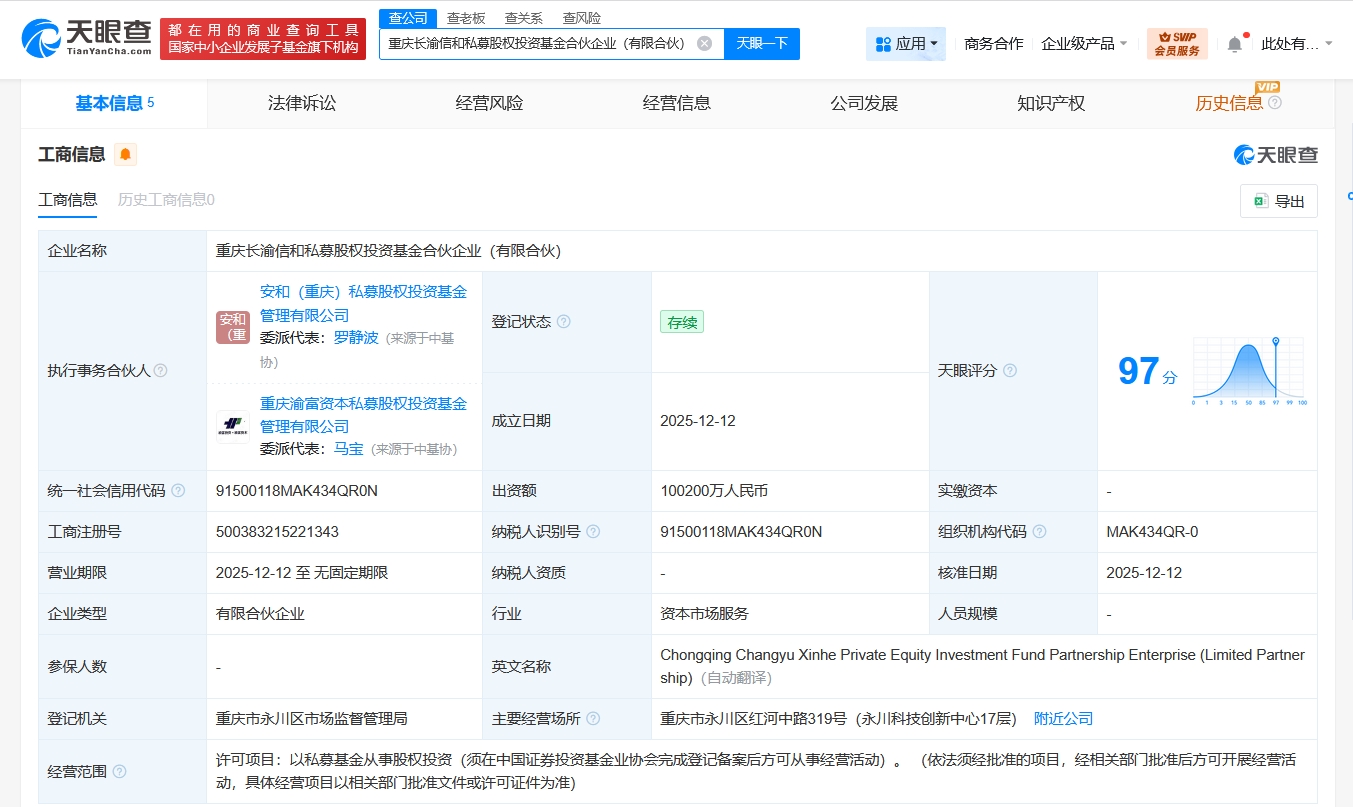 天眼查app显示,近日,重庆长渝信和私募股权投资基金合伙企业(有限合伙)成立,执行事务合伙人为安和(重庆)私募股权投资基金管理有限公司、重庆渝富资本私募股权投资基金管理有限公司,出资额10.02亿人民币,经营范围为以私募基金从事股权投资。合伙人信息显示,该基金由重庆战略性新兴产业股权投资基金合伙企业(有限合伙)、建信信托有限责任公司、长安汽车(000625)等共同出资。
