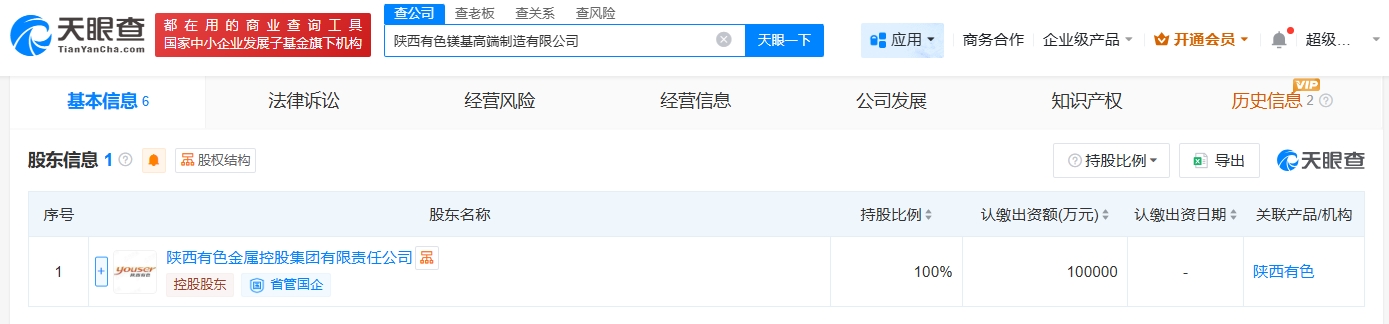 天眼查app显示,近日,陕西有色镁基高端制造有限公司成立,法定代表人为晏文豪,注册资本10亿人民币,经营范围包括有色金属铸造、有色金属压延加工、锻件及粉末冶金制品制造、常用有色金属冶炼等。股东信息显示,该公司由陕西有色金属控股集团有限责任公司全资持股。