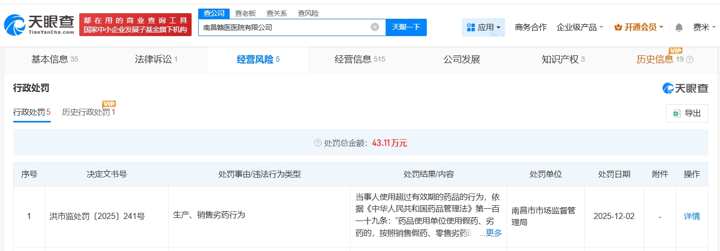 天眼查经营风险信息显示,近日,南昌赣医医院有限公司因生产、销售劣药行为,被南昌市市场监督管理局罚款6.1万余元,没收2.6万余元。