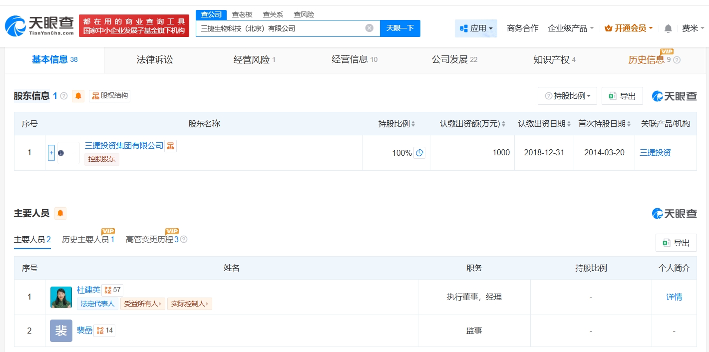 三捷生物科技(北京)有限公司成立于2014年3月,法定代表人、执行董事、经理为杜建英,注册资本1000万人民币,经营范围包括机械设备销售、电子产品销售、第一类医疗器械销售等,由三捷投资集团有限公司全资持股。