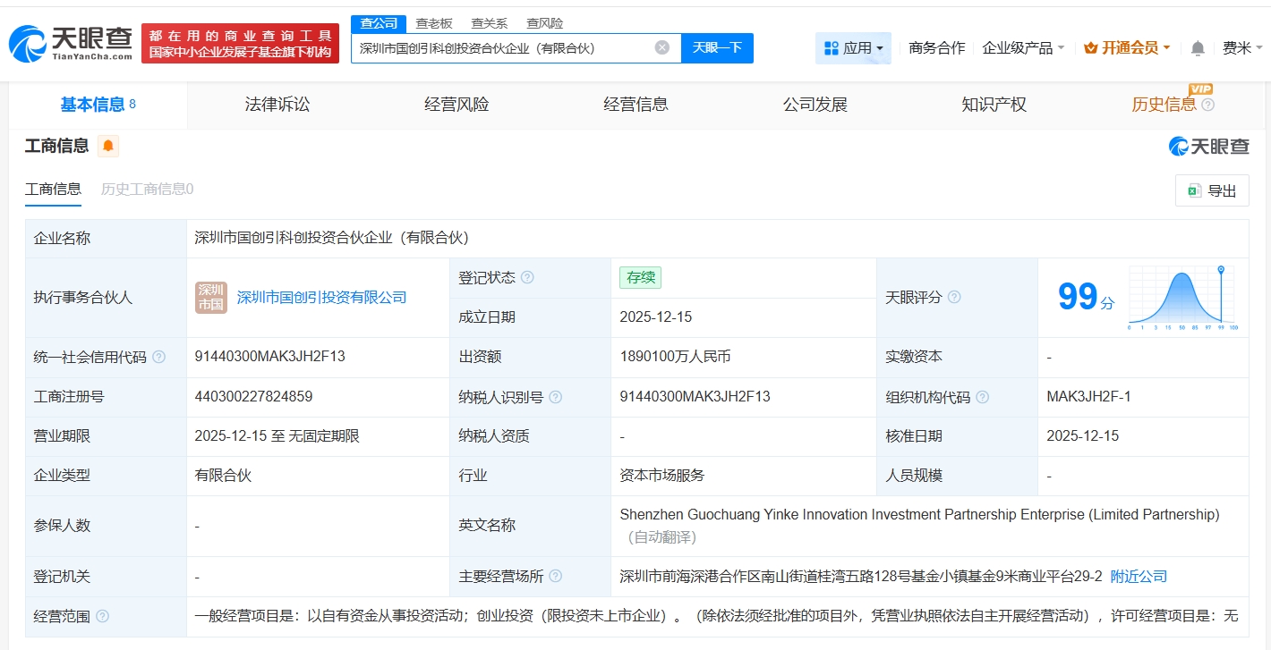 天眼查app显示,近日,深圳市国创引科创投资合伙企业(有限合伙)成立,执行事务合伙人为深圳市国创引投资有限公司,出资额189.01亿人民币,经营范围为以自有资金从事投资活动、创业投资,由深圳市引导基金投资有限公司、深圳市汇通金控基金投资有限公司、深圳市前海产业引导股权投资基金有限公司等共同出资。