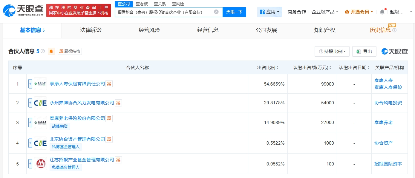 天眼查app显示,近日,招盈能合(嘉兴)股权投资合伙企业(有限合伙)成立,执行事务合伙人为江苏招银产业基金管理有限公司,出资额18.11亿人民币,经营范围为股权投资。合伙人信息显示,该合伙企业由泰康人寿保险有限责任公司、永州界牌协合风力发电有限公司、泰康养老保险股份有限公司、北京协合资产管理有限公司、江苏招银产业基金管理有限公司共同出资。