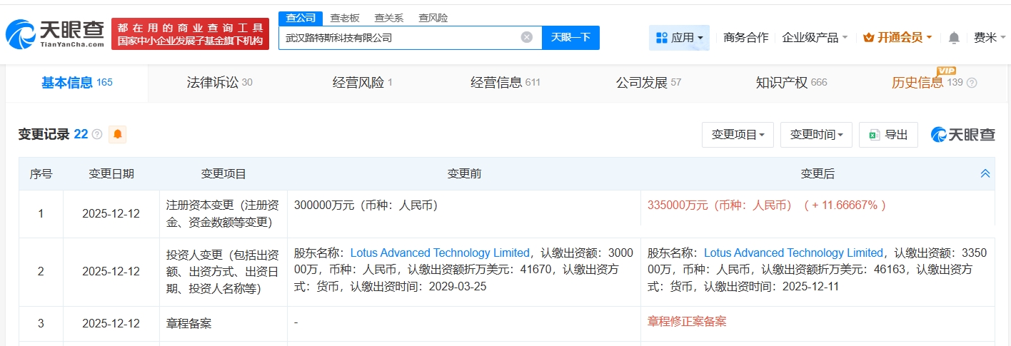 天眼查app显示,近日,武汉路特斯科技有限公司发生工商变更,注册资本由30亿人民币增至33.5亿人民币,增幅约12%。