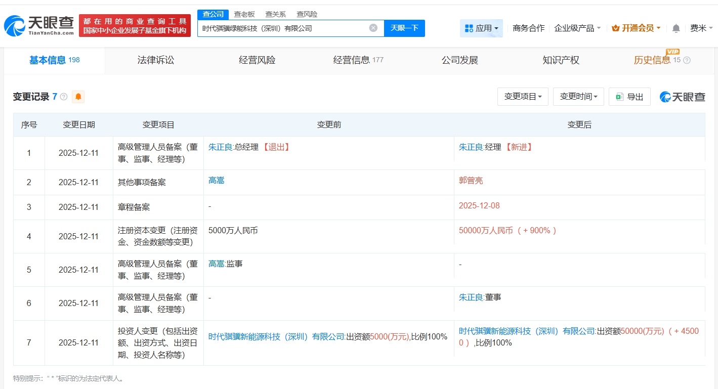 天眼查app显示,近日,时代骐骥绿能科技(深圳)有限公司发生工商变更,注册资本由5000万人民币增至5亿人民币,增幅900%,同时发生高管变更。