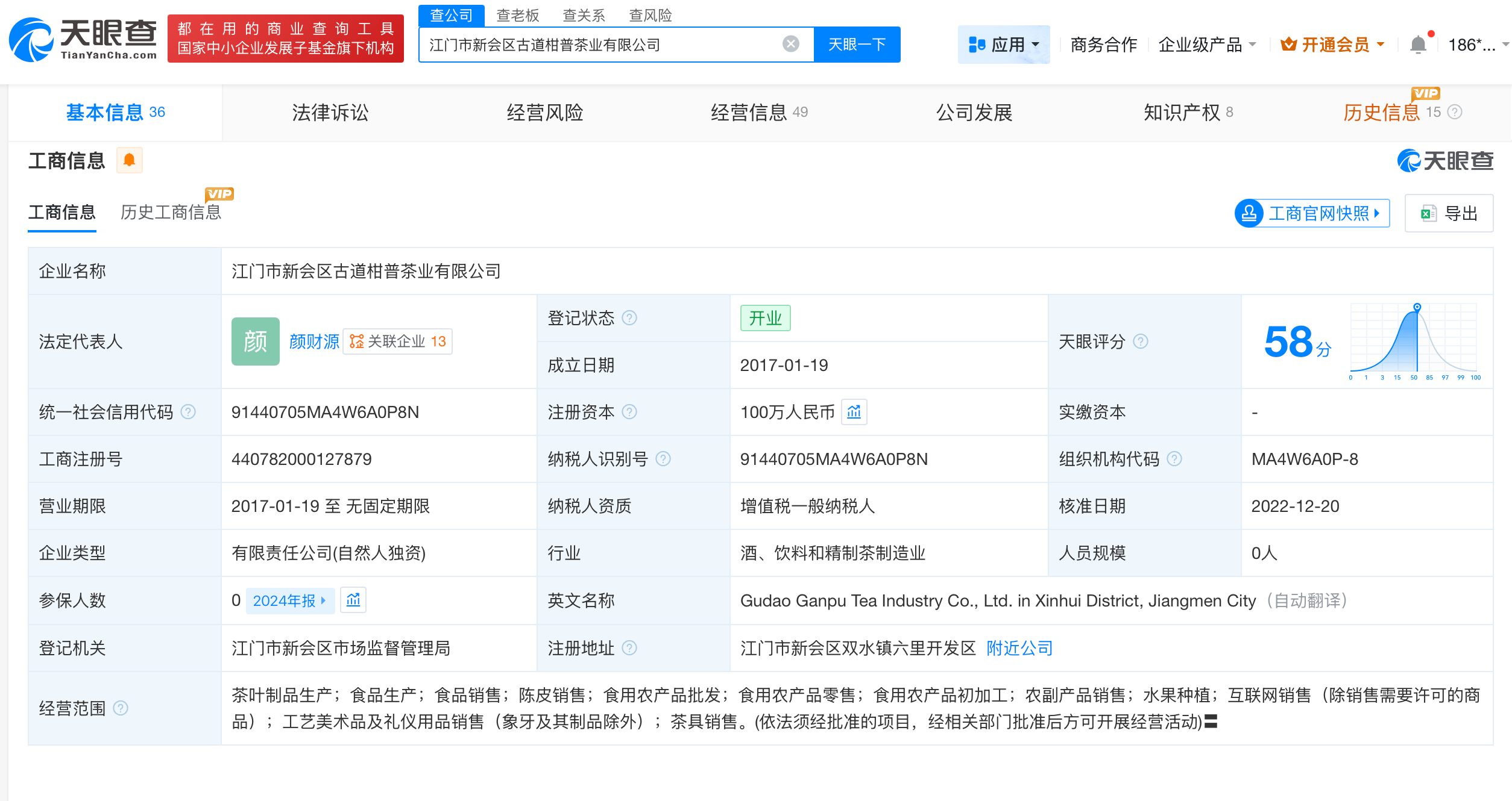 天眼查工商信息显示,涉事公司江门市新会区古道柑普茶业有限公司成立于2017年1月,法定代表人为颜财源,注册资本100万人民币,经营范围包括茶叶制品生产、食品生产、食品销售、陈皮销售等。股东信息显示,该公司由颜财源全资持股。此外,涉事公司江门市新会懂润农业有限公司成立于2023年2月,法定代表人为胡月琴,注册资本300万人民币,经营范围包括新会柑种植、新会柑销售、陈皮销售、食品销售等。股东信息显示,该公司由胡月琴、梁家焕共同持股。