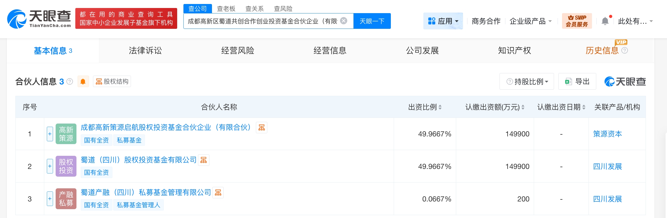 天眼查app显示,近日,成都高新区蜀道共创合作创业投资基金合伙企业(有限合伙)成立,执行事务合伙人为蜀道产融(四川)私募基金管理有限公司,出资额30亿人民币,经营范围为创业投资。合伙人信息显示,该基金由成都高新策源启航股权投资基金合伙企业(有限合伙)、蜀道(四川)股权投资基金有限公司、蜀道产融(四川)私募基金管理有限公司共同出资。