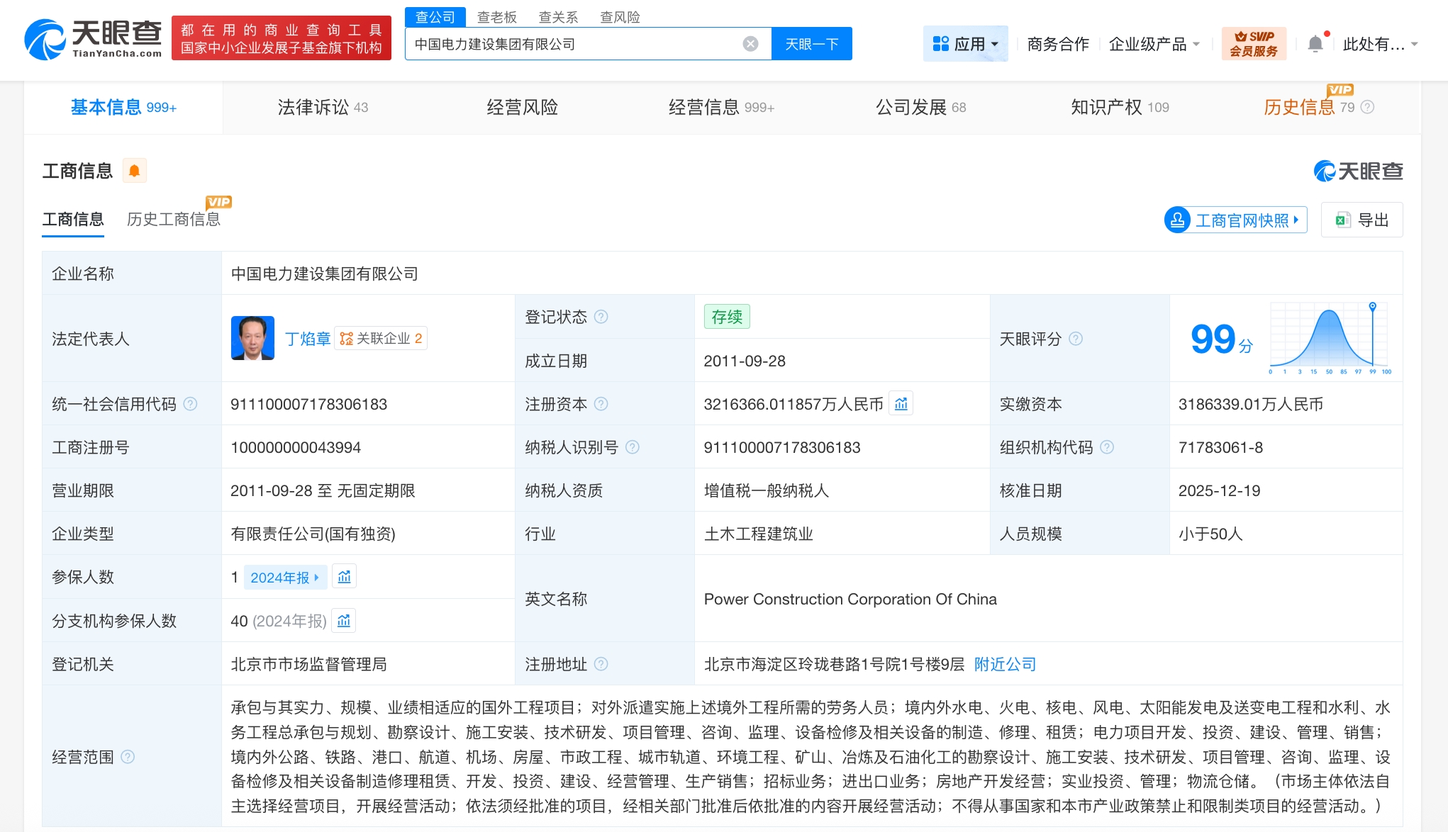 天眼查app显示,近日,中国电力建设集团有限公司发生工商变更,注册资本由约318.6亿人民币增至约321.6亿人民币。