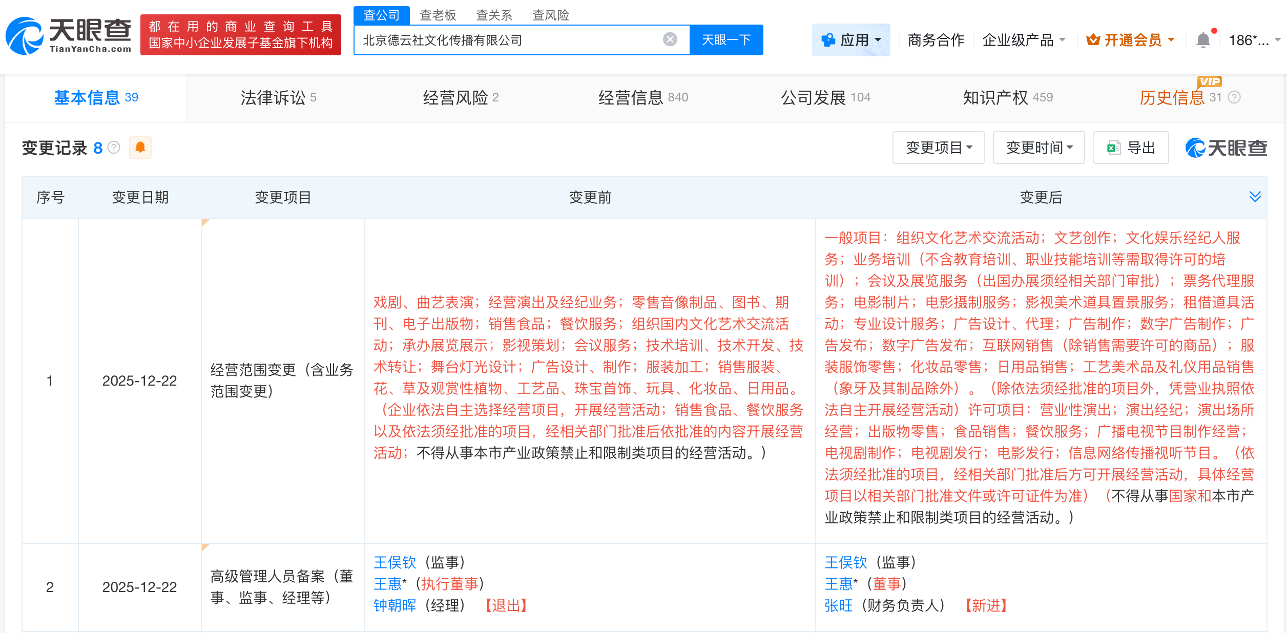 天眼查app显示,近日,北京德云社文化传播有限公司发生工商变更,钟朝晖卸任经理,张旺担任财务负责人,王惠职务由执行董事变更为董事。同时经营范围新增互联网销售、广播电视节目制作经营、电视剧制作、电视剧发行、电影发行等。