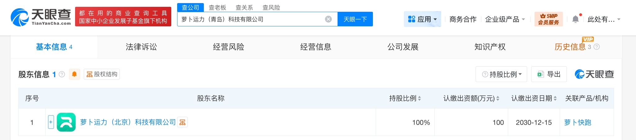 天眼查app显示,近日,萝卜运力(青岛)科技有限公司成立,法定代表人为吴刘伟,注册资本100万人民币,经营范围含人工智能基础软件开发、人工智能应用软件开发、计算机系统服务、互联网数据服务、数据处理和存储支持服务、信息系统集成服务、信息系统运行维护服务等,由萝卜快跑关联公司萝卜运力(北京)科技有限公司全资持股。