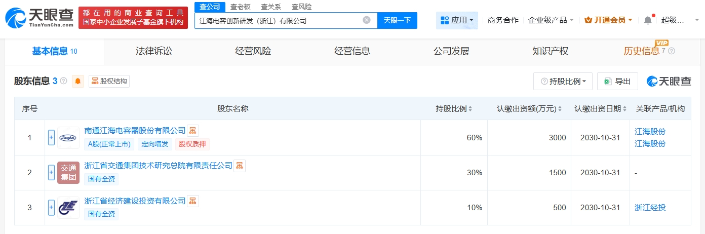 天眼查app显示,近日,江海电容创新研发(浙江)有限公司成立,法定代表人为刘知豪,注册资本5000万人民币,经营范围包括电子专用材料研发、以自有资金从事投资活动。股东信息显示,该公司由江海股份(002484)、浙江省交通集团技术研究总院有限责任公司、浙江省经济建设投资有限公司共同持股。