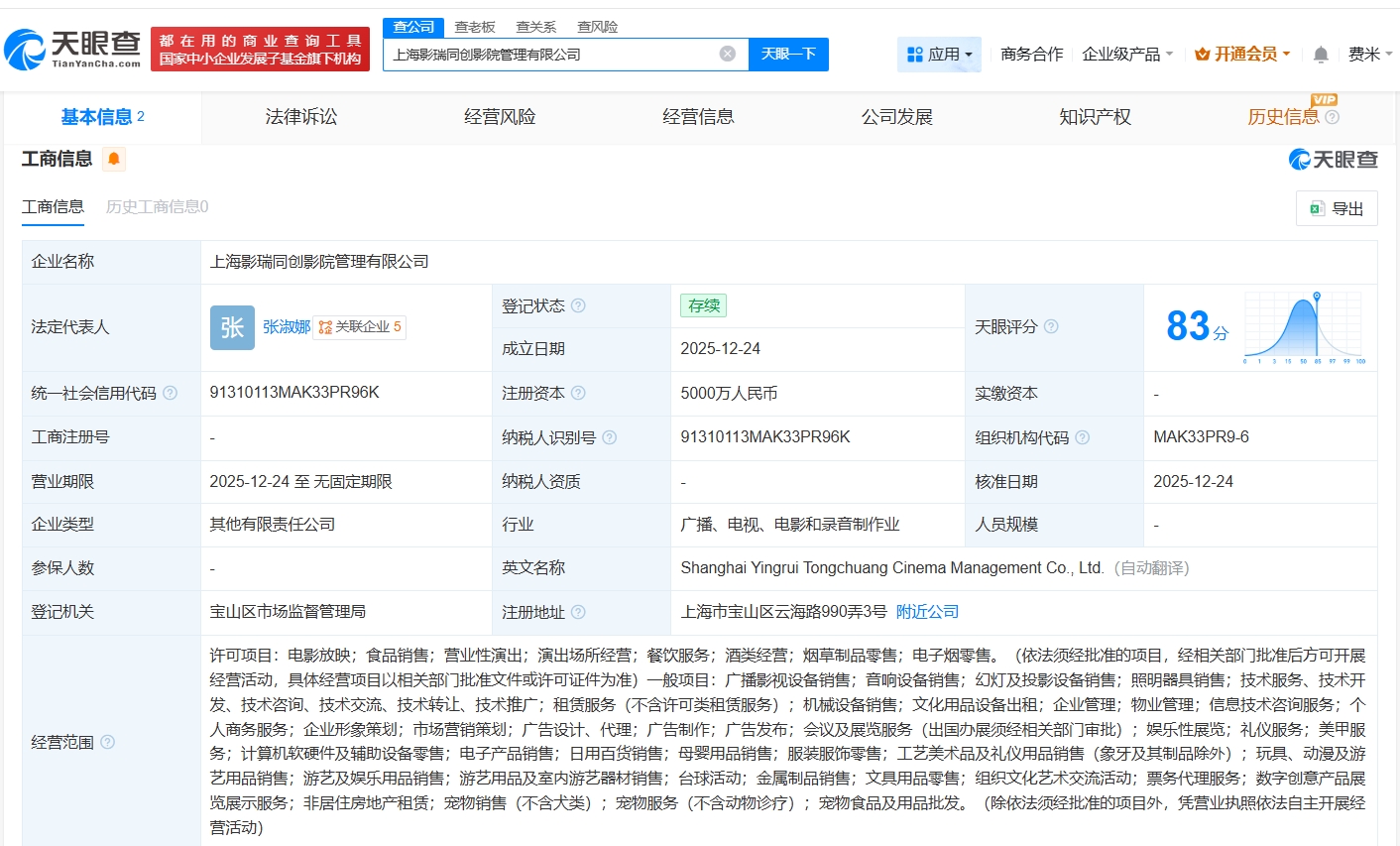 天眼查app显示,近日,上海影瑞同创影院管理有限公司成立,法定代表人为张淑娜,注册资本5000万人民币,经营范围包括电影放映、食品销售、营业性演出、演出场所经营等,由上港集团瑞泰发展有限责任公司、上海电影(601595)共同持股。