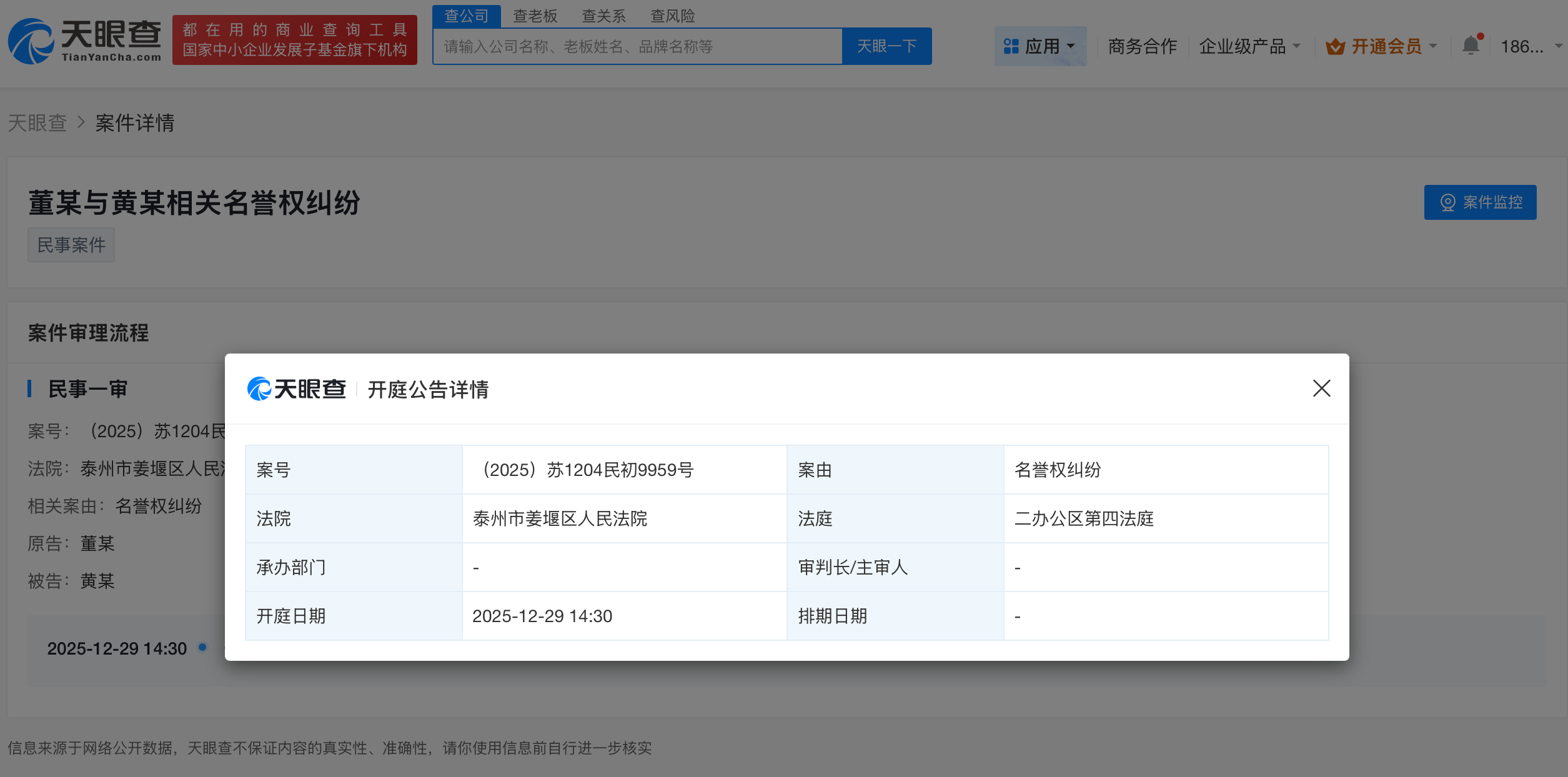 天眼查app显示,近日,董宇辉与黄某相关名誉权纠纷案件新增开庭公告,原告为董宇辉,该案将于12月29日在泰州市姜堰区人民法院开庭审理。