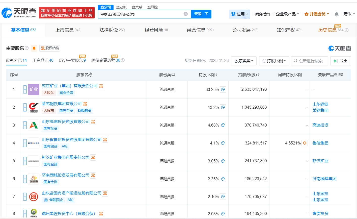 中泰证券股份有限公司成立于2001年5月,法定代表人为王洪,经营范围为证券业务、证券投资基金托管,由枣庄矿业(集团)有限责任公司、莱芜钢铁集团有限公司、山东高速投资控股有限公司等共同持股。