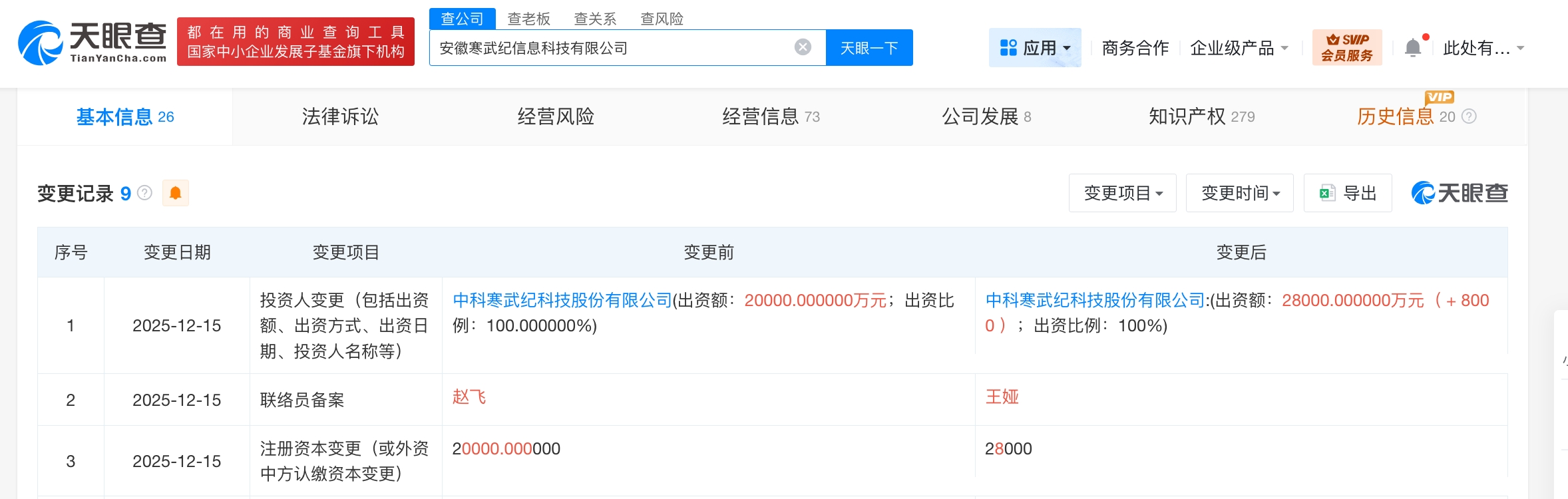 天眼查工商信息显示,近日,安徽寒武纪信息科技有限公司发生工商变更,注册资本由2亿人民币增至2.8亿人民币,增幅40%。