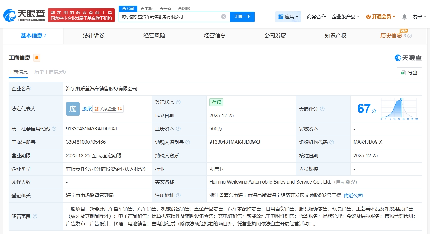 天眼查app显示,近日,海宁蔚乐萤汽车销售服务有限公司成立,法定代表人为庞梁,注册资本500万,经营范围包括新能源汽车整车销售、机械设备销售、五金产品零售等,由蔚来汽车销售服务有限公司全资持股。