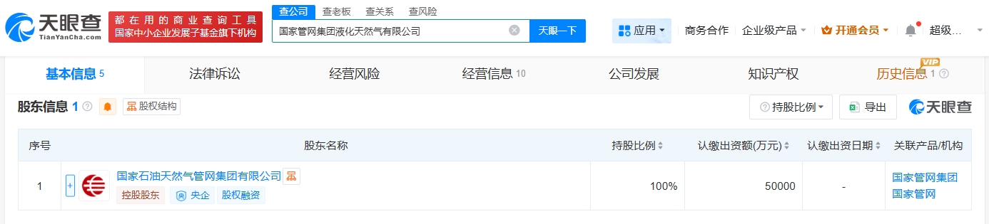 天眼查app显示,近日,国家管网集团液化天然气有限公司成立,法定代表人为王晓刚,注册资本5亿人民币,经营范围包括技术进出口、自然科学研究和实验发展、工程和技术研究和试验发展等。股东信息显示,该公司由国家石油天然气管网集团有限公司全资持股。