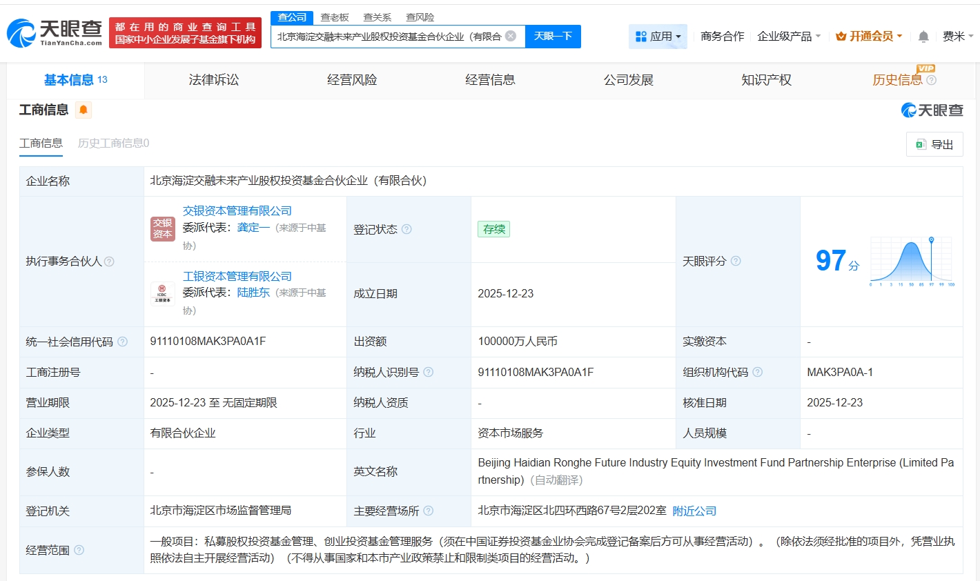 天眼查app显示,近日,北京海淀交融未来产业股权投资基金合伙企业(有限合伙)成立,执行事务合伙人为交银资本管理有限公司、工银资本管理有限公司,出资额10亿人民币,经营范围为私募股权投资基金管理、创业投资基金管理服务,由北京海泰智鑫咨询服务中心(有限合伙)、工银金融资产投资有限公司、交银金融资产投资有限公司、工银资本管理有限公司、交银资本管理有限公司共同出资。