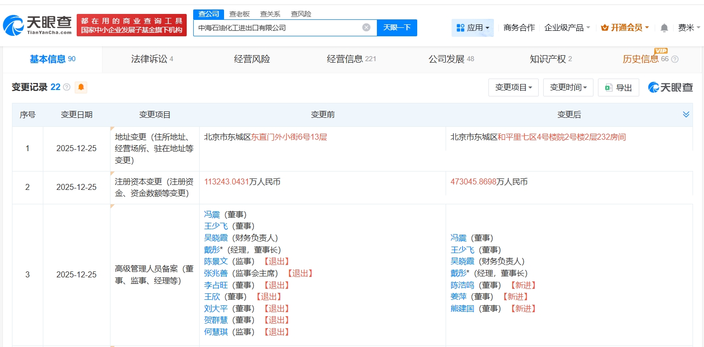 天眼查app显示,近日,中海石油化工进出口有限公司发生工商变更,注册资本由约11.3亿人民币增至约47.3亿人民币,增幅约318%,同时,多位高管发生变更。