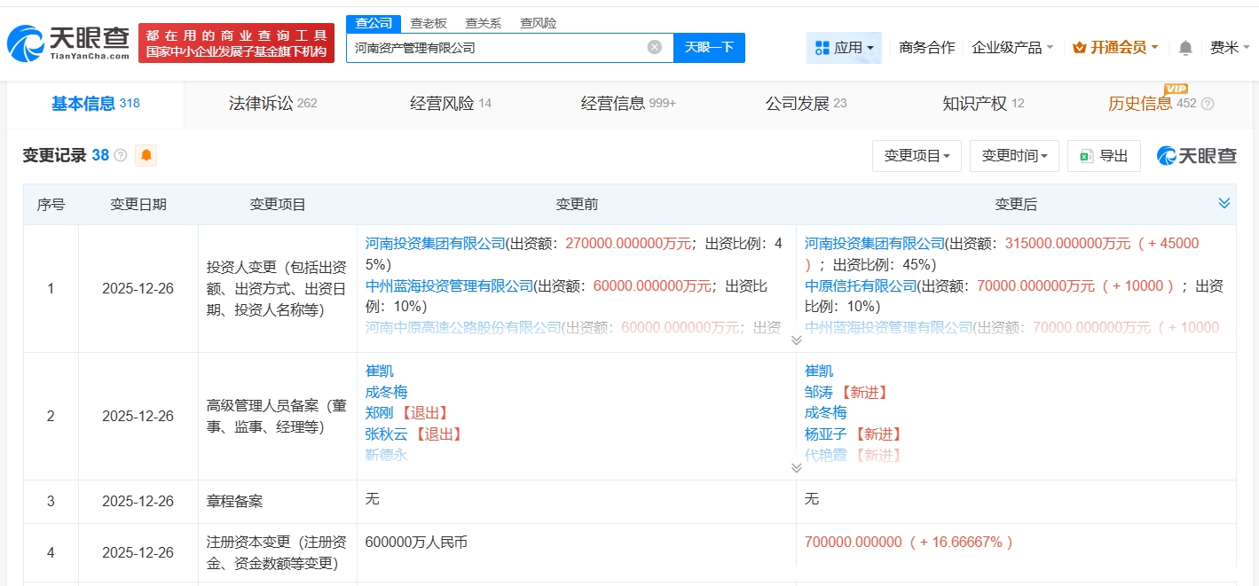 天眼查app显示,近日,河南资产管理有限公司发生工商变更,注册资本由60亿人民币增至70亿人民币,增幅约17%,同时,多位高管发生变更。
