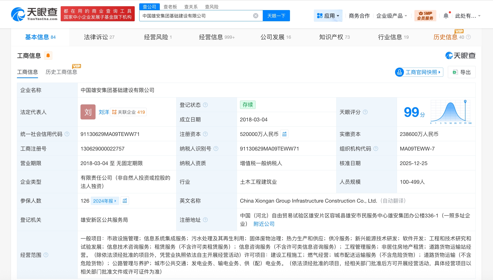 该公司成立于2018年3月,法定代表人为刘洋,经营范围含市政设施管理、信息系统集成服务、新兴能源技术研发、软件开发、工程和技术研究和试验发展、信息技术咨询服务等,由中国雄安集团有限公司全资持股。