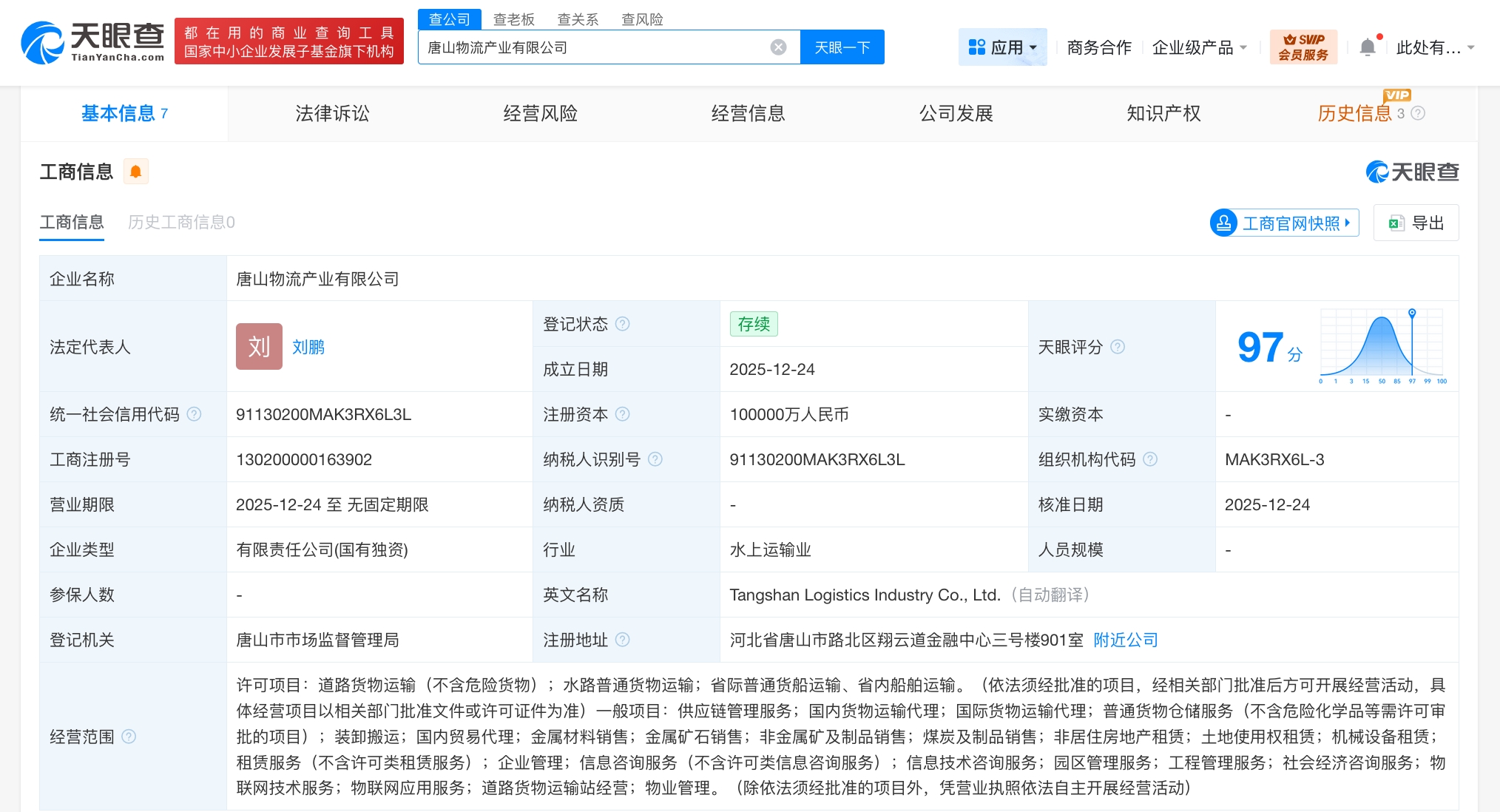 天眼查app显示,近日,唐山物流产业有限公司成立,法定代表人为刘鹏,注册资本10亿人民币,经营范围含道路货物运输、水路普通货物运输、供应链管理服务、国内货物运输代理、普通货物仓储服务、国内贸易代理、煤炭及制品销售、非居住房地产租赁等,由唐山市人民政府国有资产监督管理委员会全资持股。
