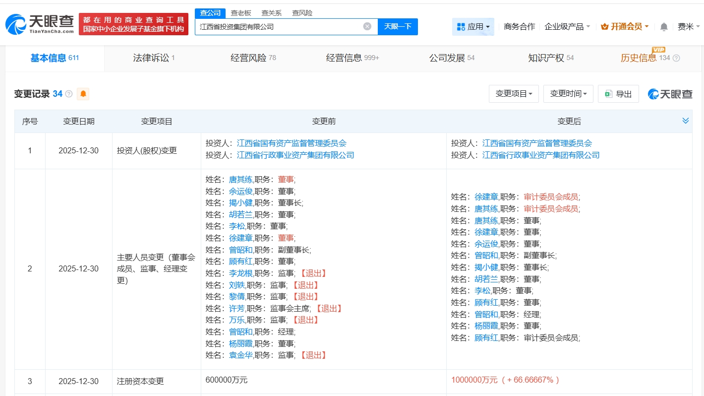 天眼查app显示,近日,江西省投资集团有限公司发生工商变更,注册资本由60亿人民币增至100亿人民币,增幅约67%,同时,多位高管发生变更。