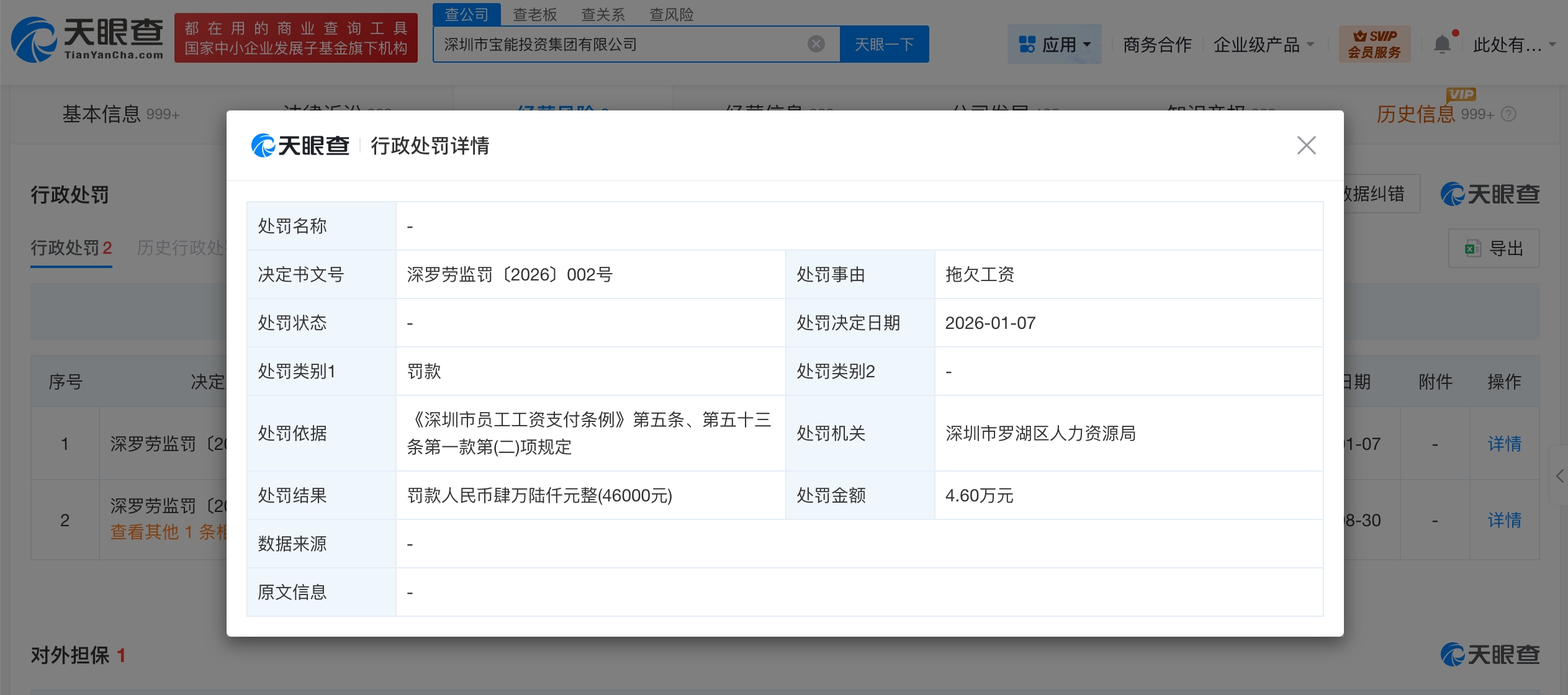 天眼查天眼风险信息显示,近日,深圳市宝能投资集团有限公司因拖欠工资,被深圳市罗湖区人力资源局罚款4.6万元。