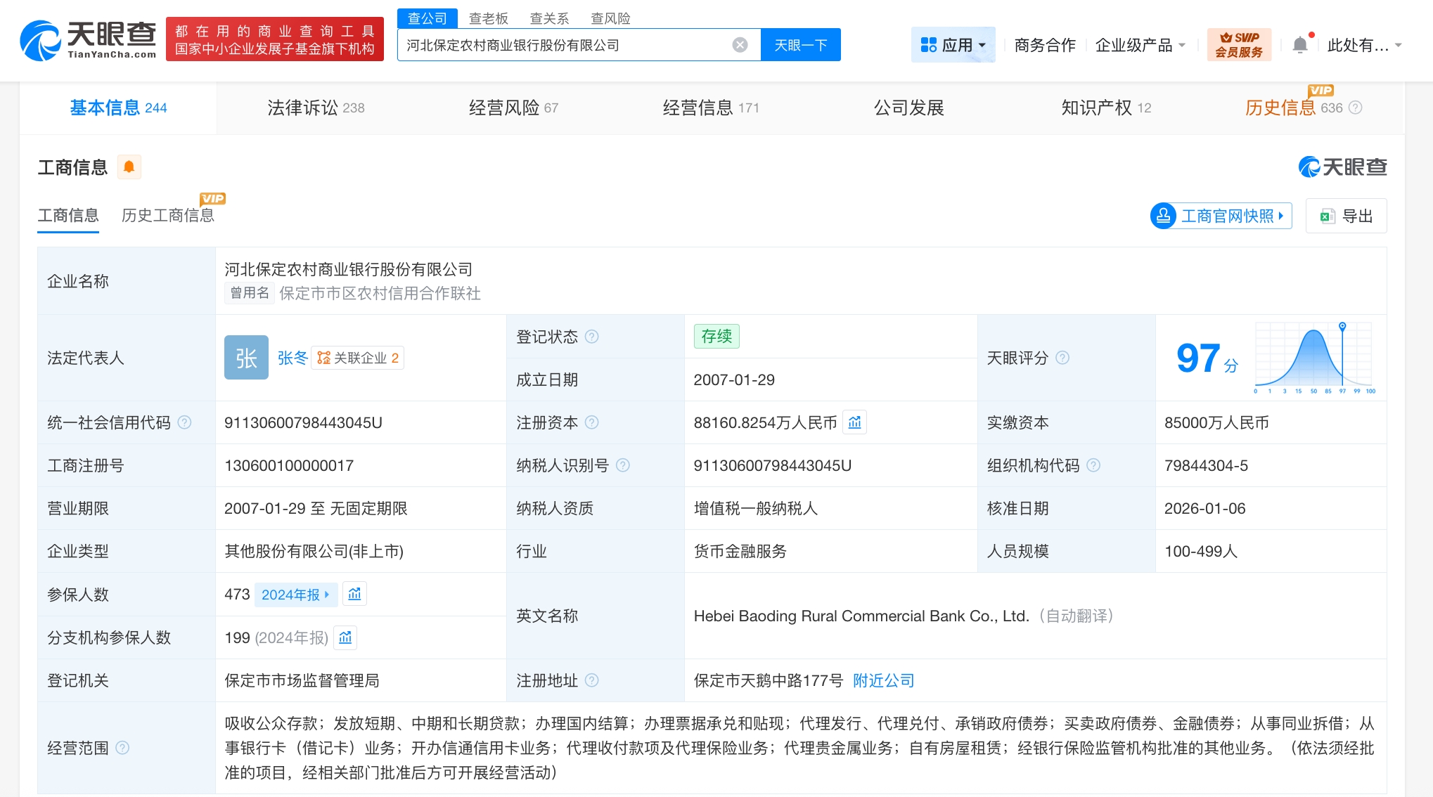 天眼查工商信息显示,近日,河北保定农村商业银行股份有限公司发生工商变更,注册资本由8.5亿人民币增至约8.8亿人民币,增幅约3.7%。