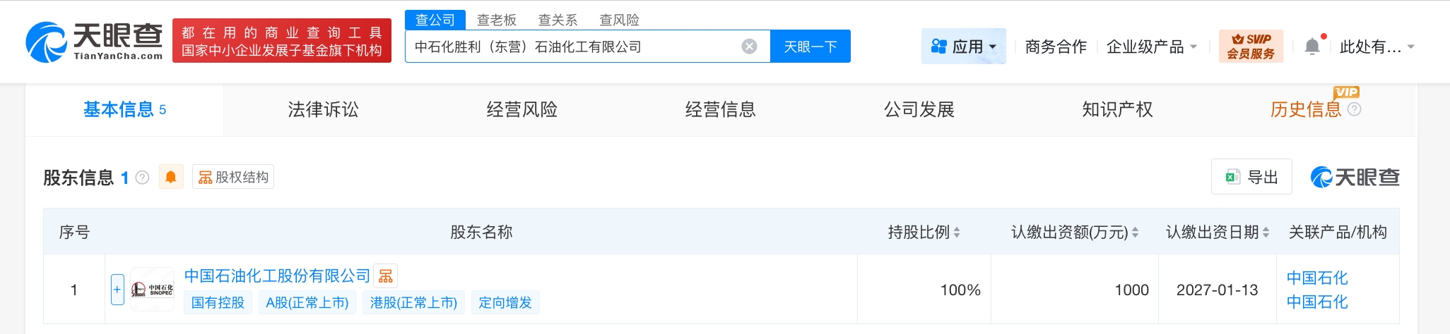 天眼查工商信息显示,近日,中石化胜利(东营)石油化工有限公司成立,法定代表人为崔国居,注册资本1000万人民币,经营范围含润滑油销售、石油制品制造、石油制品销售、化工产品生产、化工产品销售、仪器仪表修理、计量技术服务等。股东信息显示,该公司由中国石化(600028)全资持股。