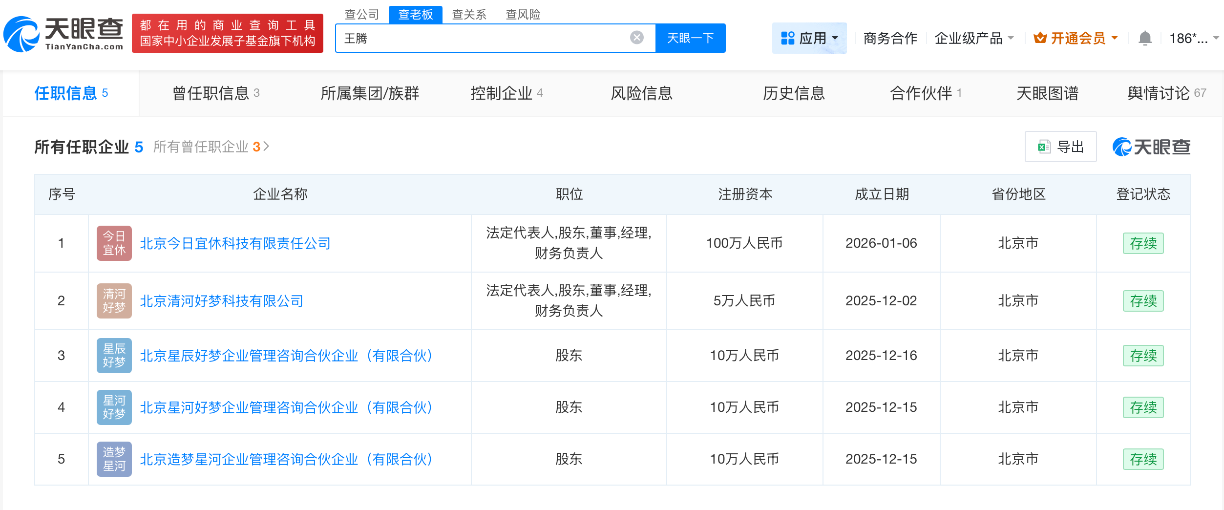 天眼查app显示,王腾名下关联北京今日宜休科技有限责任公司、北京清河好梦科技有限公司、北京星辰好梦企业管理咨询合伙企业(有限合伙)、北京星河好梦企业管理咨询合伙企业(有限合伙)等企业,均为存续状态,王腾在上述企业担任法定代表人、董事等职务,成立时间自2025年12月2日至2026年1月6日。