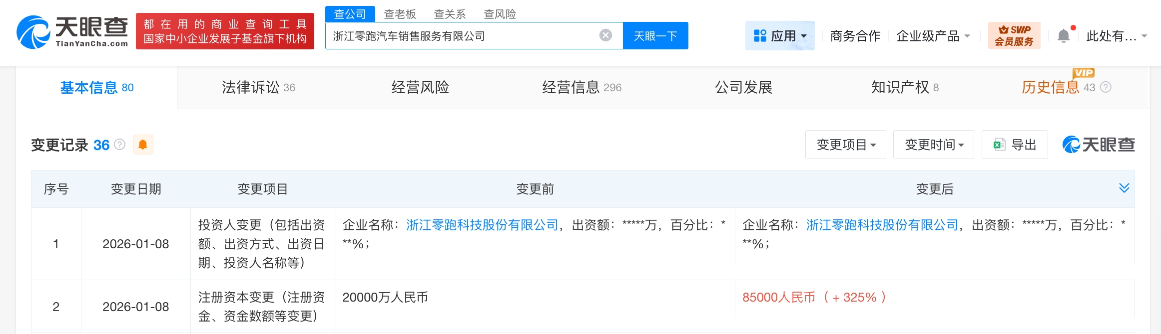 天眼查工商信息显示,近日,浙江零跑汽车销售服务有限公司发生工商变更,注册资本由2亿人民币增至8.5亿人民币,增幅325%。