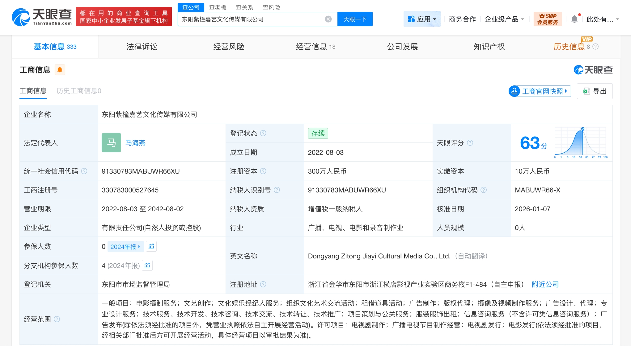 东阳紫橦嘉艺文化传媒有限公司成立于2022年8月,法定代表人为马海燕,注册资本300万人民币,经营范围含电影摄制服务、文化娱乐经纪人服务、组织文化艺术交流活动、租借道具活动、信息咨询服务、广播电视节目制作经营、电视剧发行等。股东信息显示,该公司现由杨紫、马海燕分别持股90%、10%。