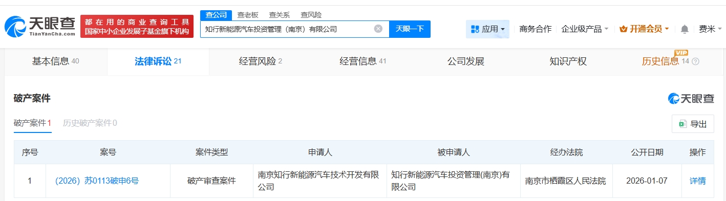 天眼查天眼风险信息显示,近日,知行新能源汽车投资管理(南京)有限公司新增一则破产审查案件,申请人为拜腾汽车关联公司南京知行新能源汽车技术开发有限公司,经办法院为南京市栖霞区人民法院。