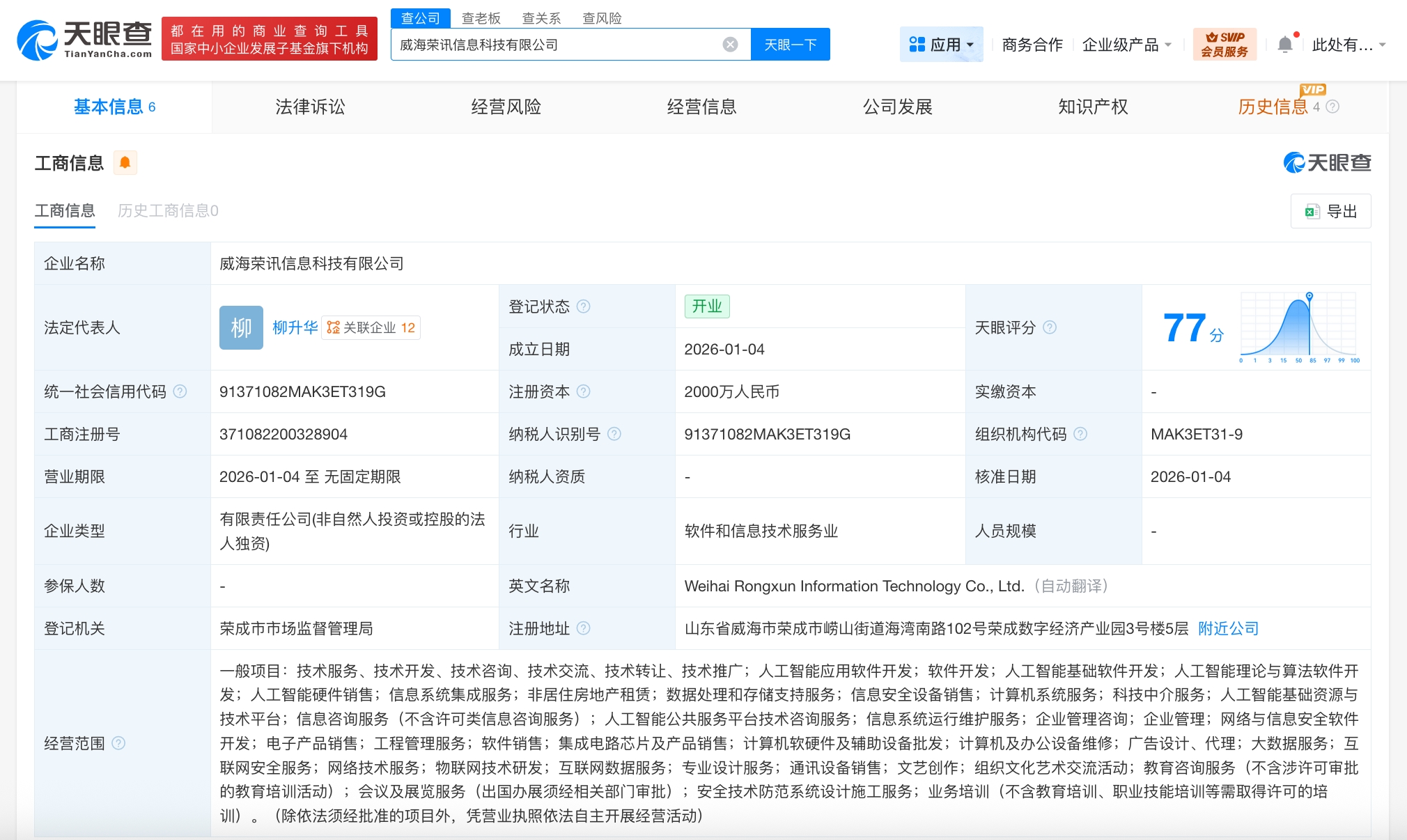 天眼查工商信息显示,近日,威海荣讯信息科技有限公司成立,法定代表人为柳升华,注册资本2000万人民币,经营范围含人工智能应用软件开发、软件开发、人工智能基础软件开发、人工智能理论与算法软件开发、数据处理和存储支持服务、信息安全设备销售、计算机系统服务等。股权全景穿透图显示,该公司由泉讯人工智能(山东)有限公司全资持股,后者为科大讯飞(002230)全资子公司。