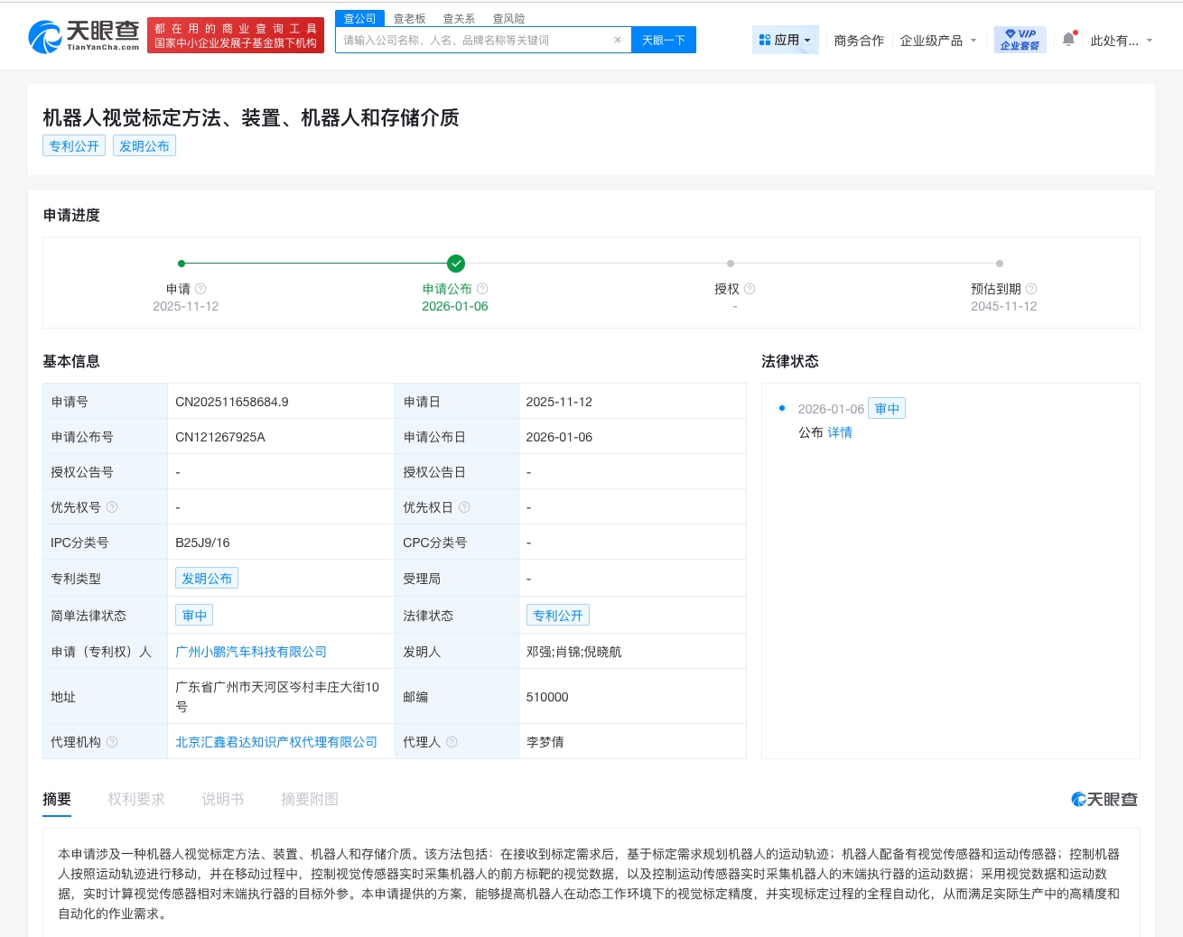 天眼查知识产权信息显示,近日,广州小鹏汽车科技有限公司申请的“机器人视觉标定方法、装置、机器人和存储介质”专利公布。