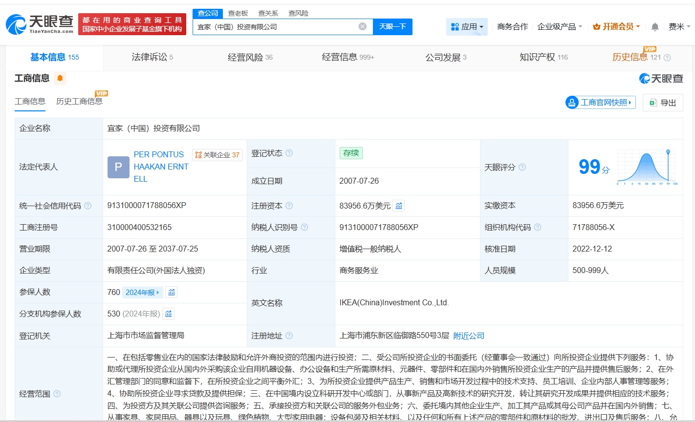 天眼查工商信息显示,宜家(中国)投资有限公司成立于2007年7月,法定代表人为per pontus haakan erntell,注册资本约8.4亿美元,经营范围包括在包括零售业在内的国家法律鼓励和允许外商投资的范围内进行投资等。股东信息显示,该公司由ingka pro holding b.v.全资持股。对外投资信息显示,该公司对外投资42家企业,其中39家处于存续状态,长春宜家家居有限公司、宜家家具配件(深圳)有限公司、北京宜家咨询有限公司已注销。
