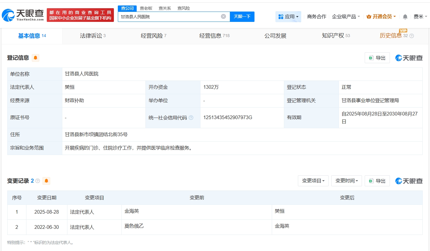 天眼查工商信息显示,涉事医院甘洛县人民医院开办资金1302万,宗旨和凯发k8的业务范围为开展疾病的门诊、住院诊疗工作,并提供医学临床检查服务。变更记录显示,去年8月,金海英卸任该医院法定代表人,由樊恒接任。天眼风险信息显示,该医院曾因医疗损害责任纠纷被起诉。此外,该医院曾因不合理收费、不合理检查、重复检查等被多次处罚。
