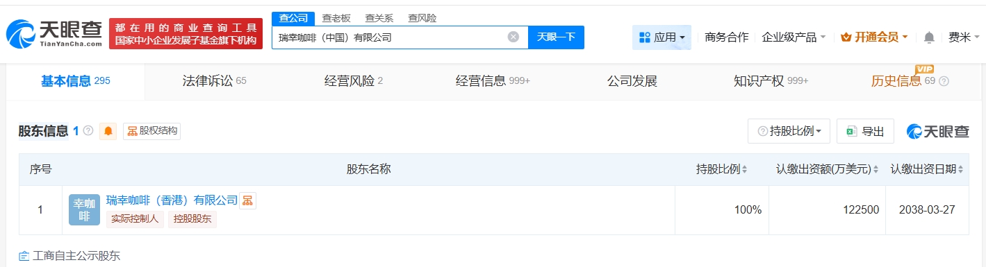天眼查工商信息显示,瑞幸咖啡关联公司瑞幸咖啡(中国)有限公司成立于2018年3月,法定代表人为郭谨一,注册资本12.25亿美元,经营范围包括餐饮服务、食品销售、出版物互联网销售等。股东信息显示,该公司由瑞幸咖啡(香港)有限公司全资持股。对外投资信息显示,该公司对外投资67家企业,其中62家处于存续状态,包括瑞幸咖啡信息技术(厦门)有限公司、瑞幸咖啡(上海)有限公司、瑞幸咖啡(厦门)有限公司等。