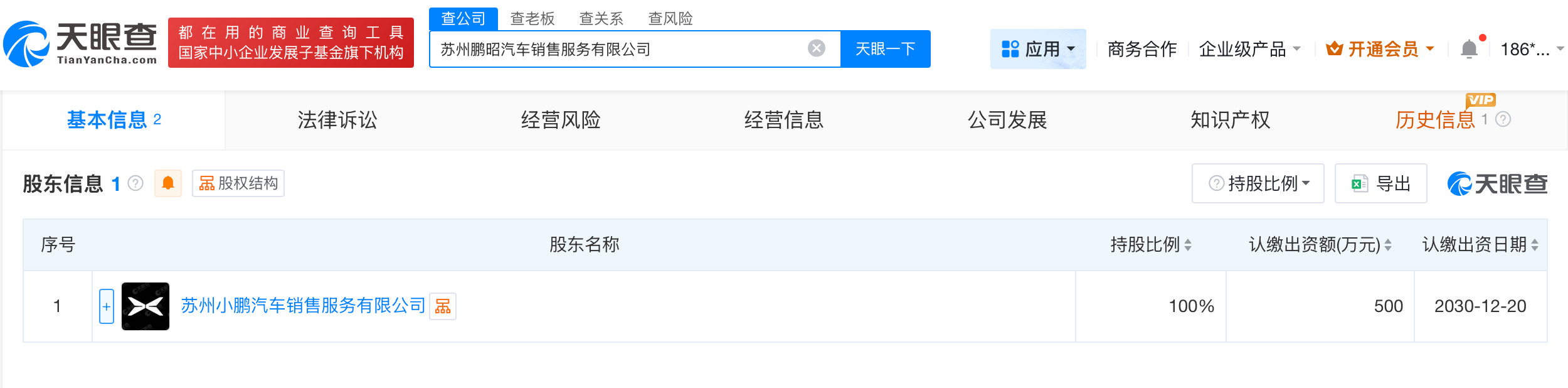 天眼查工商信息显示,近日,苏州鹏昭汽车销售服务有限公司成立,法定代表人为韩键,注册资本500万人民币,经营范围含汽车销售、新能源汽车整车销售、新能源汽车电附件销售、汽车零配件批发、汽车零配件零售、商务代理代办服务、信息技术咨询服务、信息咨询服务等。股东信息显示,该公司由小鹏汽车旗下苏州小鹏汽车销售服务有限公司全资持股。