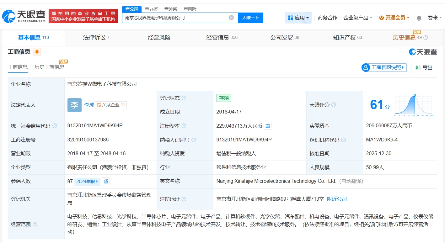 南京芯视界微电子科技有限公司成立于2018年4月,法定代表人为李成,经营范围包括从事半导体科技电子产品领域内的技术开发、技术转让、技术咨询和技术服务等。股东信息显示,该公司现由李成、杭州毅鸿股权投资合伙企业(有限合伙)及上述新增股东等共同持股。