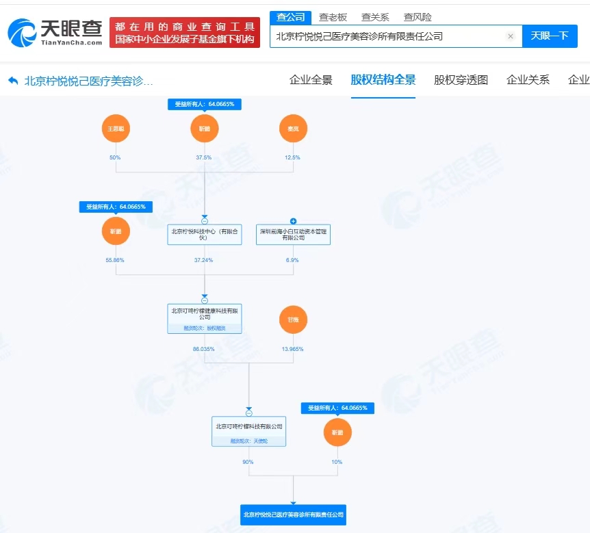 天眼查工商信息显示,近日,北京柠悦悦己医疗美容诊所有限责任公司成立,法定代表人为陈伟,注册资本100万人民币,经营范围包括医疗美容服务、生活美容服务、诊所服务等,股权全景穿透图显示,该公司由北京叮咚柠檬科技有限公司、靳鹏分别持股90%、10%,其中贾跃亭前妻甘薇在北京叮咚柠檬科技有限公司的持股比例约为14%,王思聪、秦岚通过北京柠悦科技中心(有限合伙)间接持股北京叮咚柠檬科技有限公司。公开资料显示,柠悦由靳鹏创立,王思聪、秦岚担任联合创始人。
