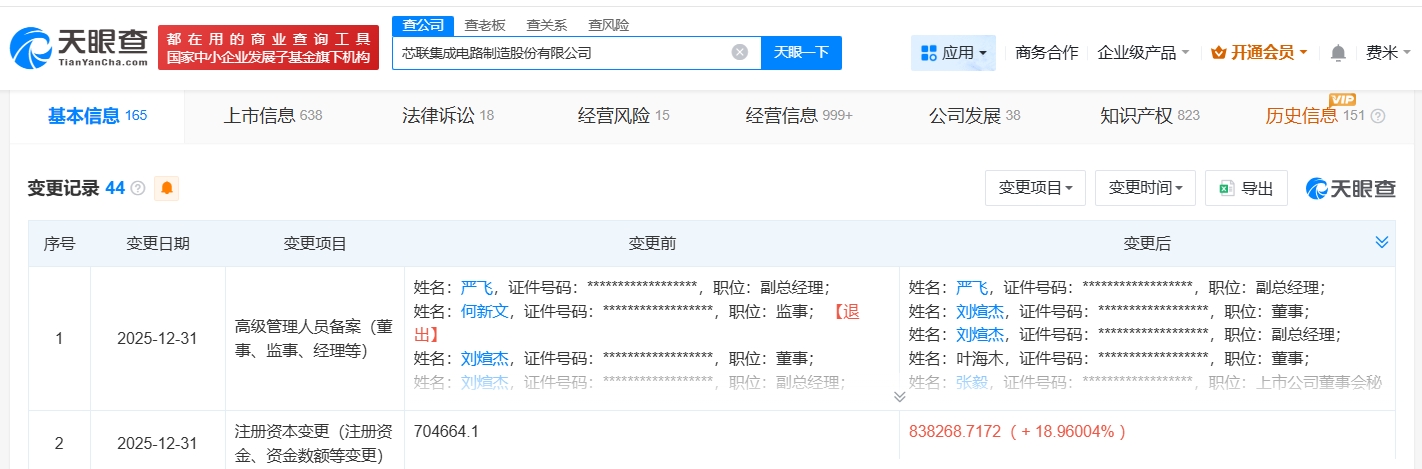 天眼查工商信息显示,近日,芯联集成(688469)发生工商变更,注册资本由约70.5亿人民币增至约83.8亿人民币,增幅约19%,同时,多位主要人员发生变更。